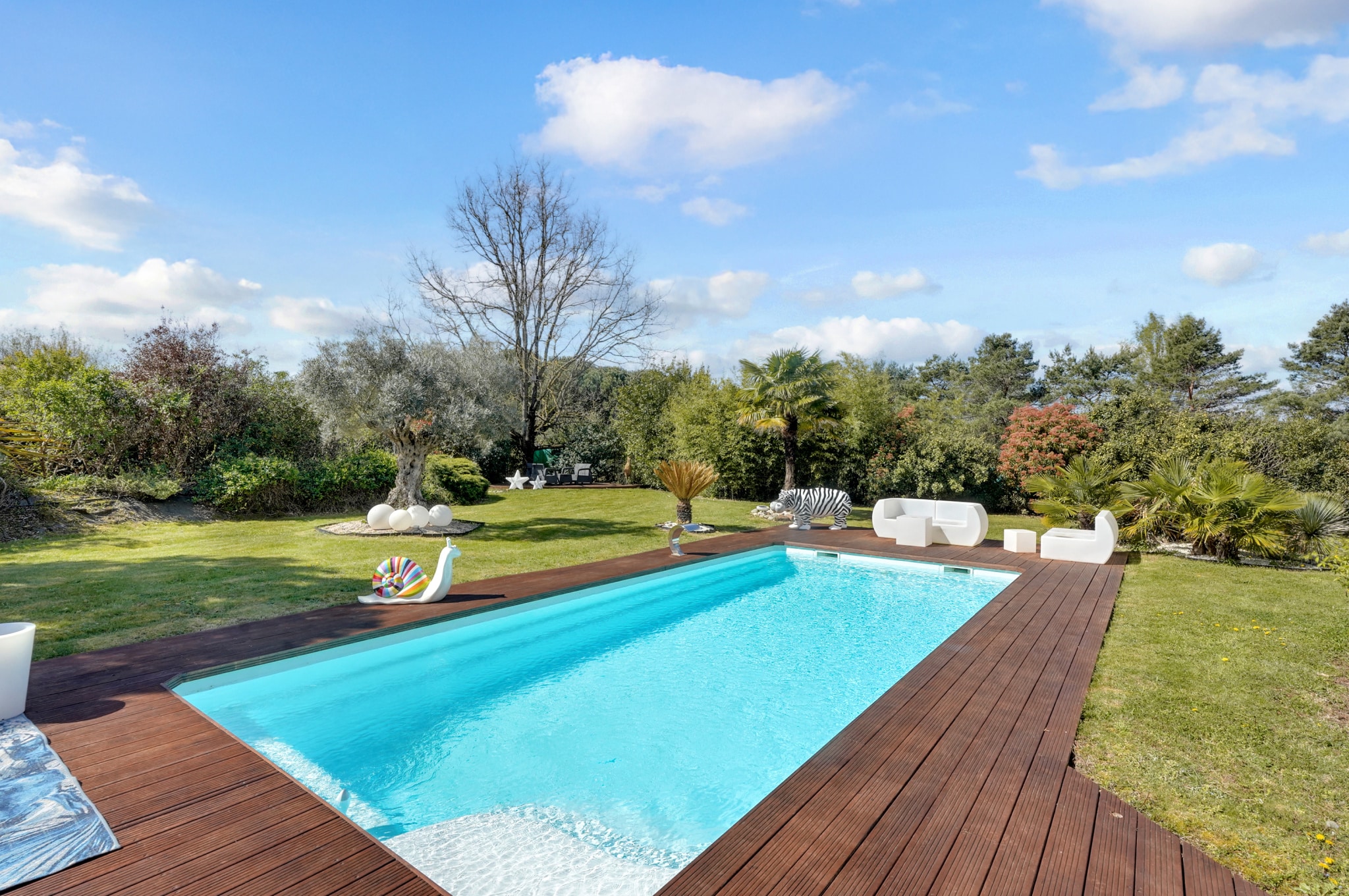 L' extérieur sans vis-à-vis finira de vous séduire, dès les premiers pas, le regard est happé par une vaste parcelle parfaitement arborée et paysagée. Les arbres y dessinent des ombres douces. Ici, tout est propre, soigné, harmonieux -- un écrin de verdure où l'on respire profondément.