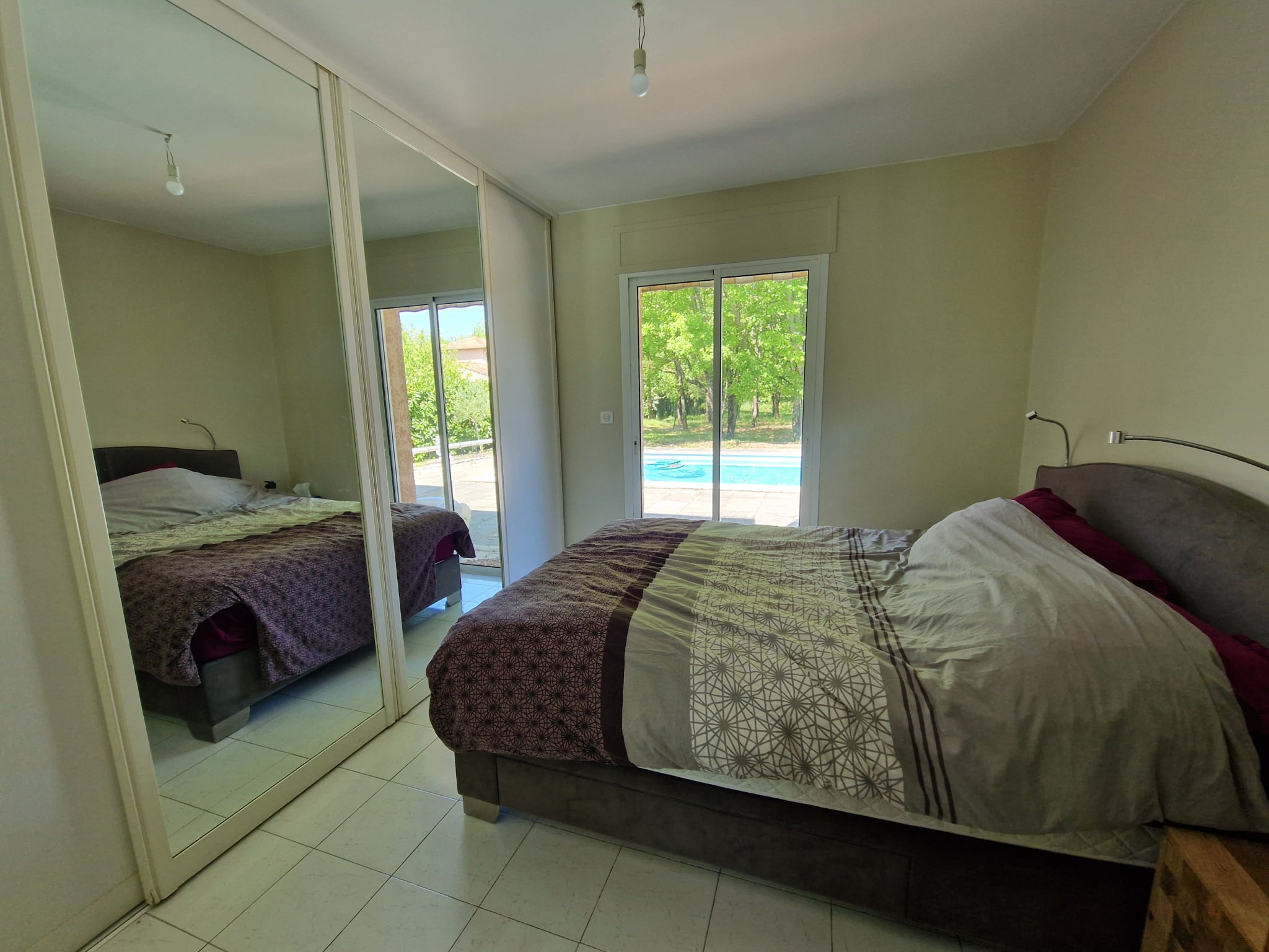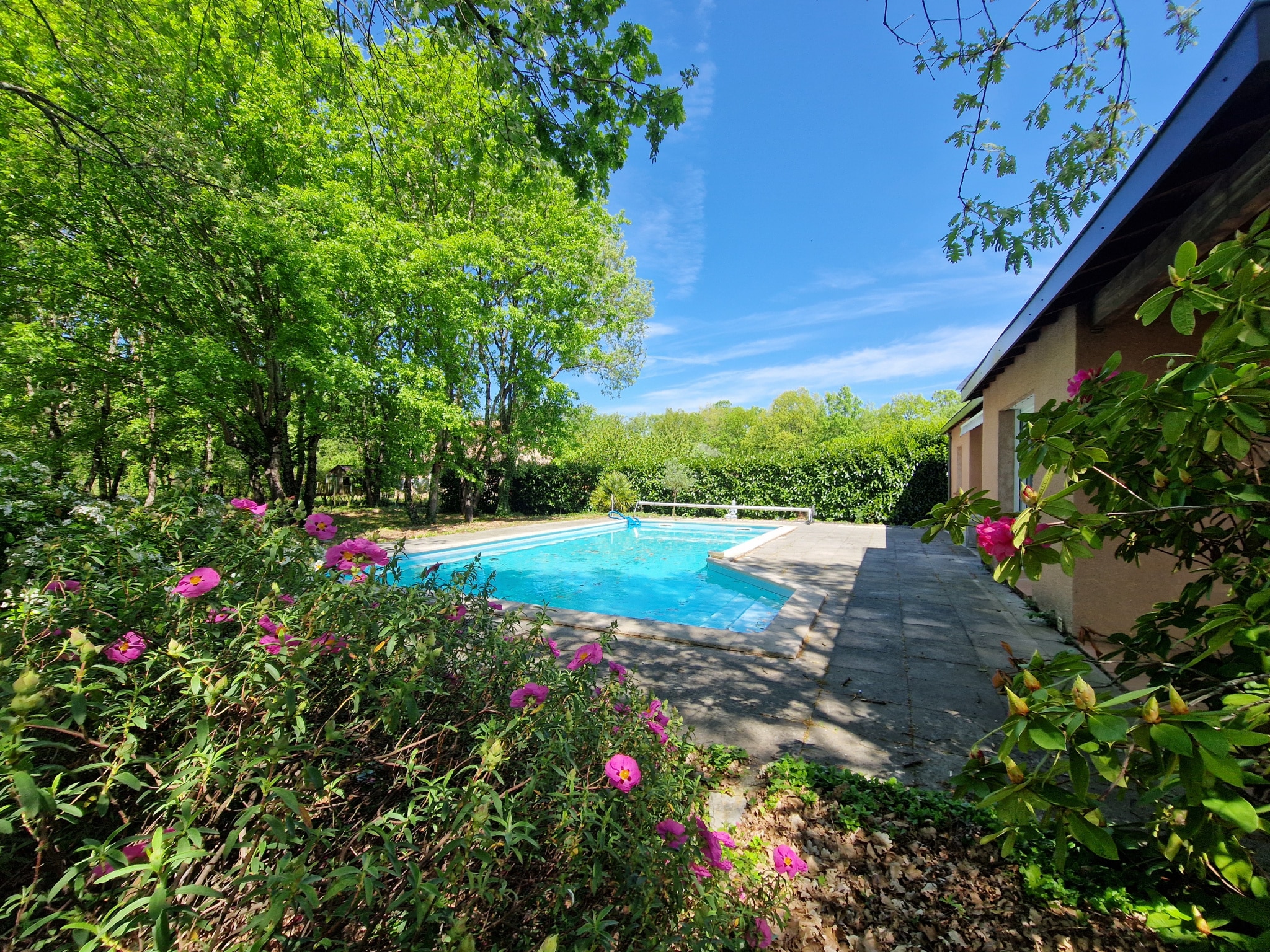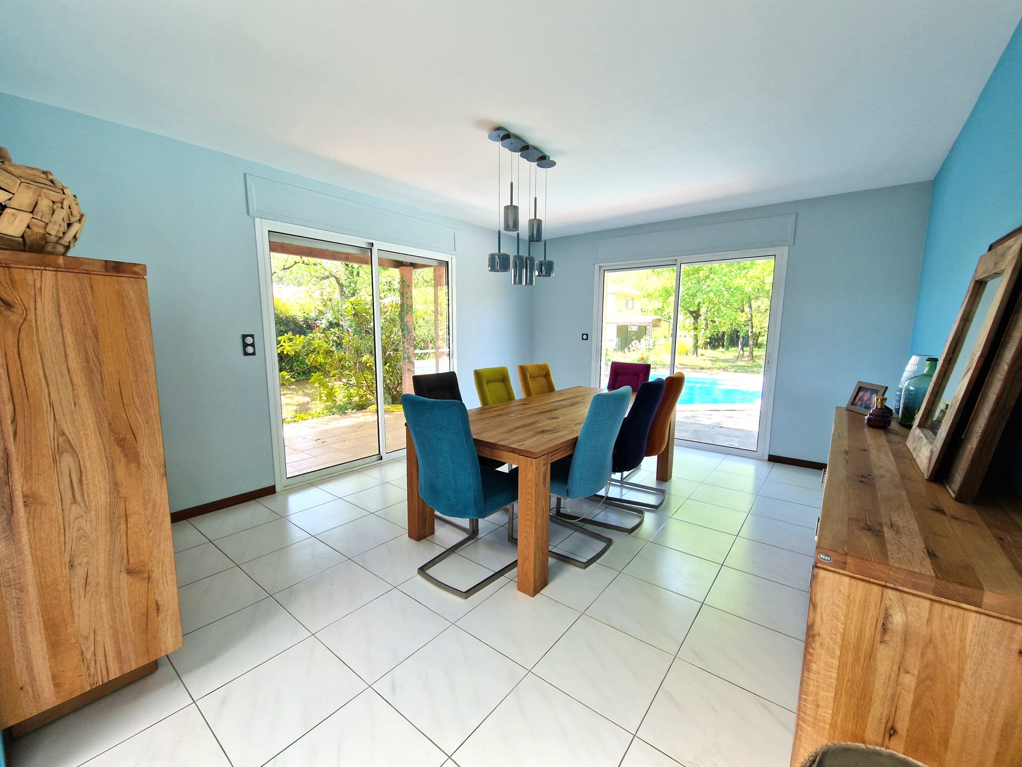 A l'extérieur, un jardin arboré, de grandes terrasses et une piscine.