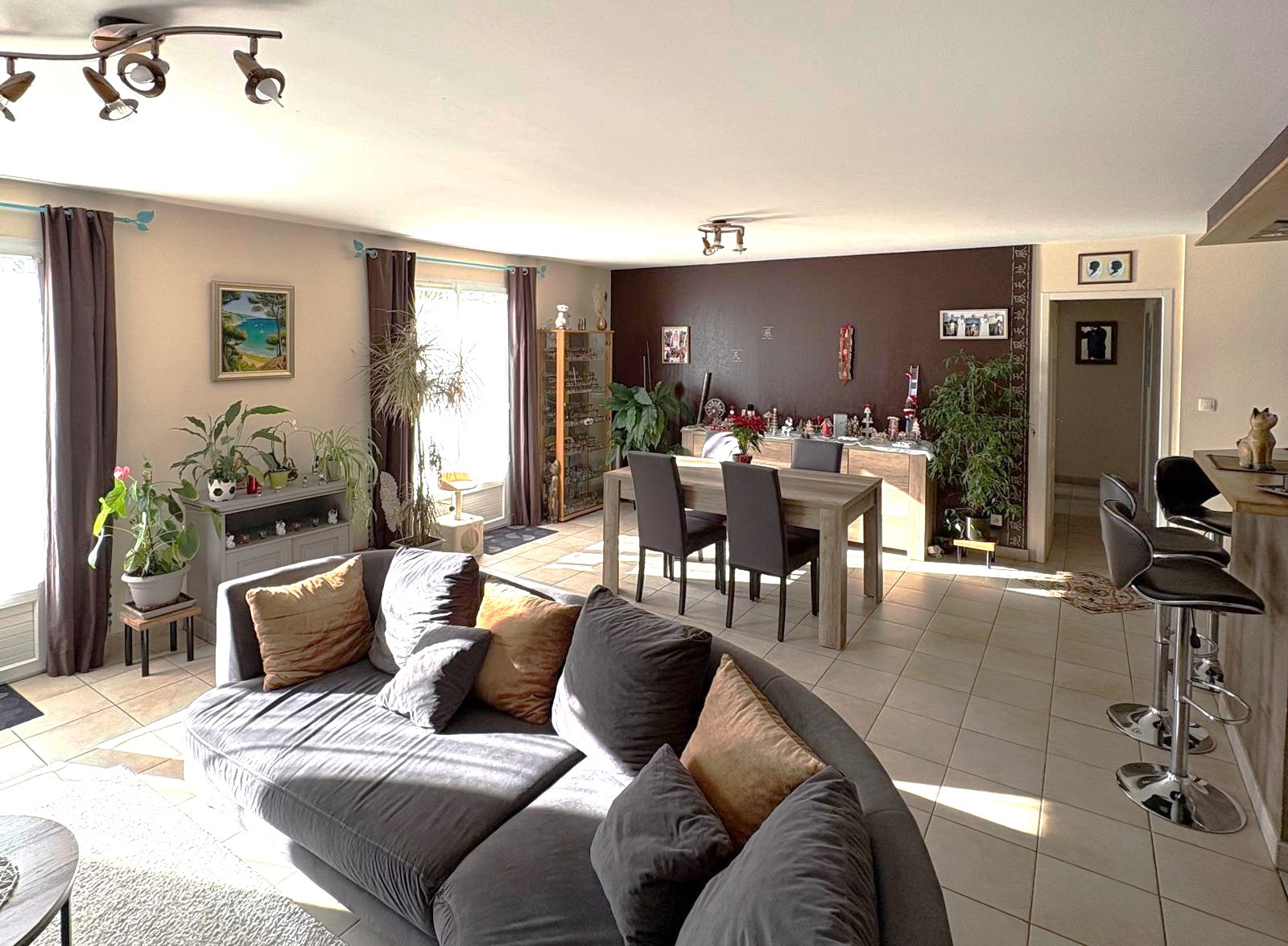LOU vous propose une entrée, une pièce à vivre climatisée spacieuse et traversante avec cuisine semi-ouverte, trois chambres, cellier/buanderie, salle de bain, wc.